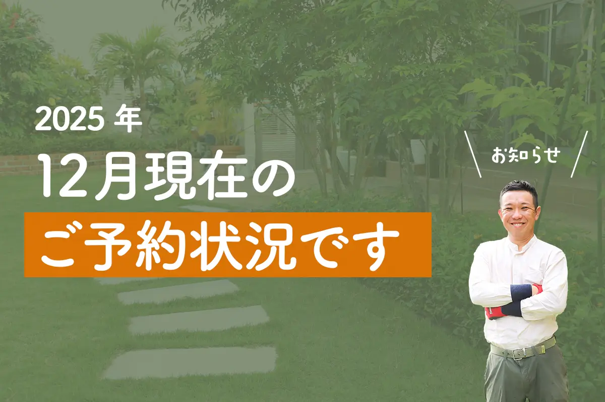 12月現在の予約状況 2025 12/30 お知らせ 2025年12月30日 12月現在の予約状況です。 2026年3月まではなんとなくいっぱいになりました。 これからご連絡をいただきますと作業はおそらく4月以降になるかと思います。 ご連絡をお待ちしていまーす。 お知らせ ひたちなか市 剪定 庭仕事 庭作り 庭師 庭次郎 草刈り この記事が気に入ったら フォローしてね! Follow Me よかったらシェアしてね! URLをコピーしました! URLをコピーしました! ハマショーで納めましょー 関連記事 【先着15名様限定】2026年・年明けご予約キャンペーンの枠は満枠となりました! 2025年12月30日 【先着15名様限定】お得な期間で剪定!2026年・年明けご予約キャンペーン!のお知らせ 2025年10月9日 2025年・年内のご予約状況 2025年8月7日 2025年お盆までのご予約状況 2025年6月20日 5月現在のご予約状況です。 2025年5月8日 3月現在・今ところのご予約状況 2025年3月23日 庭次郎でございます。 2021年6月23日