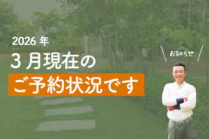 3月現在の予約状況 2026 3/02 お知らせ 2026年3月2日 3月現在の予約状況です。 2026年4月までご予約がいっぱいとなりました。 これからご連絡をいただきますと作業はおそらく5月以降になるかと思います。 おかげさまでありがとうございます!ご連絡をお待ちしていまーす。 お知らせ ひたちなか市 剪定 庭仕事 庭作り 庭師 庭次郎 草刈り この記事が気に入ったら フォローしてね! Follow Me よかったらシェアしてね! URLをコピーしました! URLをコピーしました! 12月現在の予約状況 関連記事 12月現在の予約状況 2025年12月30日 【先着15名様限定】2026年・年明けご予約キャンペーンの枠は満枠となりました! 2025年12月30日 【先着15名様限定】お得な期間で剪定!2026年・年明けご予約キャンペーン!のお知らせ 2025年10月9日 2025年・年内のご予約状況 2025年8月7日 2025年お盆までのご予約状況 2025年6月20日 5月現在のご予約状況です。 2025年5月8日 3月現在・今ところのご予約状況 2025年3月23日 庭次郎でございます。 2021年6月23日